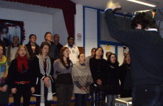 Complice la serataccia, quando finalmente chiama a raccolta il coro succede un fenomeno curioso: più di quaranta voci stanno per farsi ascoltare da un pubblico di non più di una decina di persone.