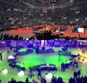In alto, vicino alla volta del Palazzo, i quattro grandi schermi posti a quadrato, permetterano in qualsiasi punto delle gradinate la visione dei filmati, dei primi piani e dei dettagli.