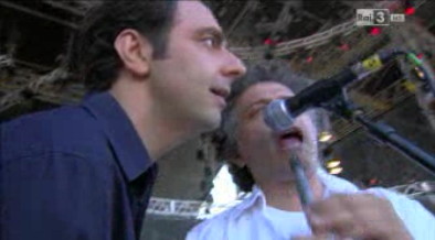 Subito dopo, sempre spalleggiato da Barbarossa, Marcorè si esibisce in una spassosa imitazione di Antonio Di Pietro, che fa da introduzione all’ingresso di uno dei gruppi più amati e rappresentativi: i Modena City Ramblers, che esordiscono con ‘I cento passi’, dedicata a Peppino Impastato.