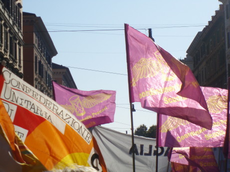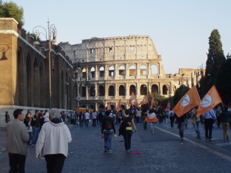 Scavalcando velocemente un tentativo di picchetto, organizzato (credo) dai ragazzi del servizio d’ordine dei COBAS, che incitavano a non abbandonare il percorso originario, seguiamo dunque le chiare indicazioni ricevute, di deviare verso il Colosseo, e poi da qui verso il Circo Massimo.