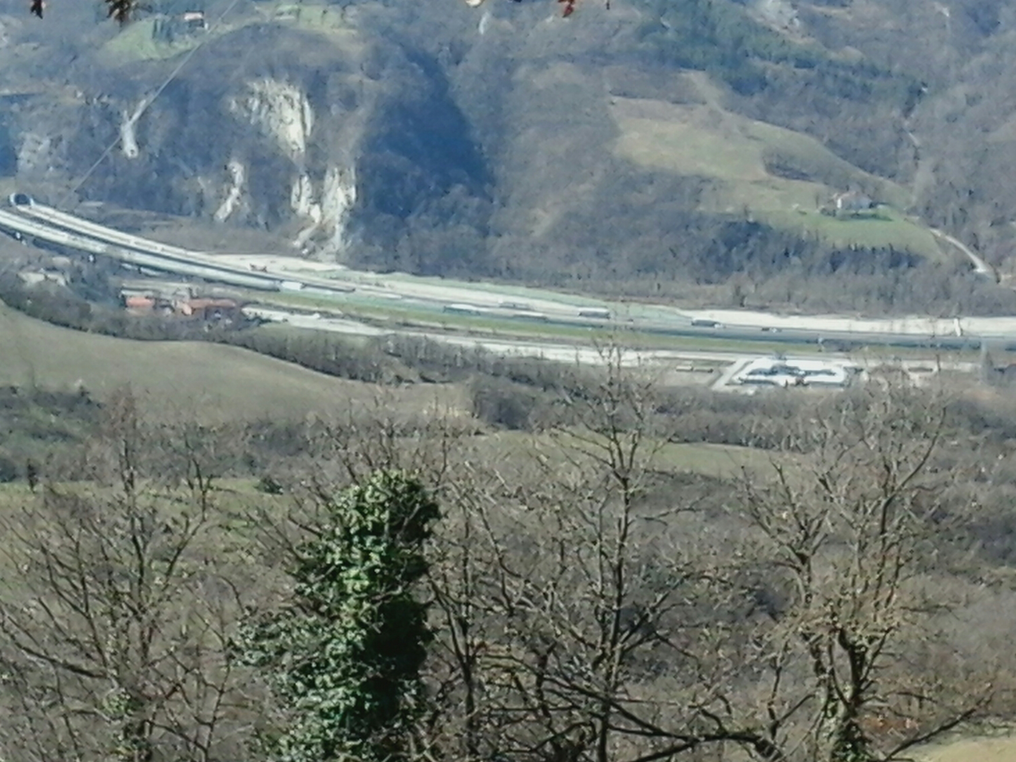 Il nastro dell’autostrada, laggiù, sulla destra, con il potere rombante degli autoveicoli ridicolizzato: da quassù sembrano modellini lenti e capaci solo di unirsi in un cupo coro ronzante.