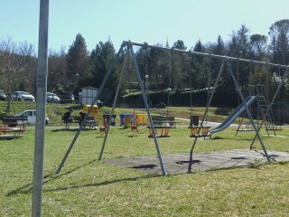 Una panchina del luminoso parco, pieno di altalene e di altri giochi,