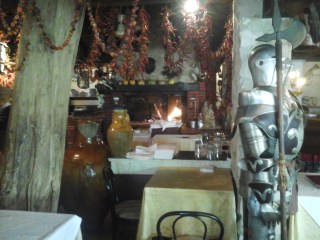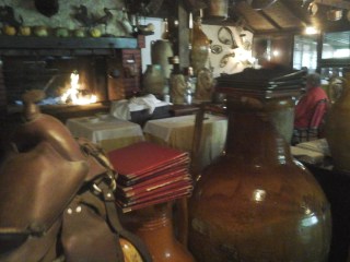 Entriamo in una sala semibuia, rischiarata dal fuoco del camino e zeppa di vestigia del passato; l’atmosfera è molto suggestiva.
