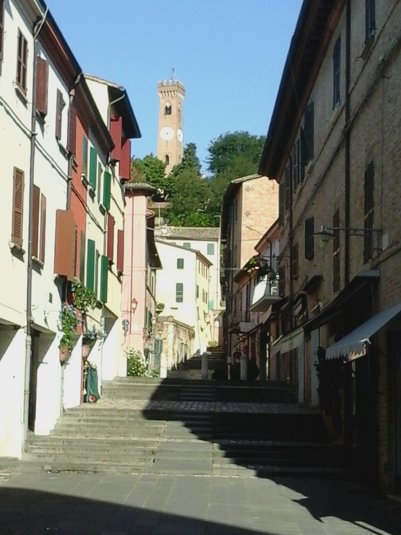 La cittadina di Santarcangelo è il centro urbano più importante incontrato fin qui e mi offre, oltre al pieno di albicocche di una simpatica anziana fruttivendola nell’ormai famoso contenitore, diversi spunti fotografici.