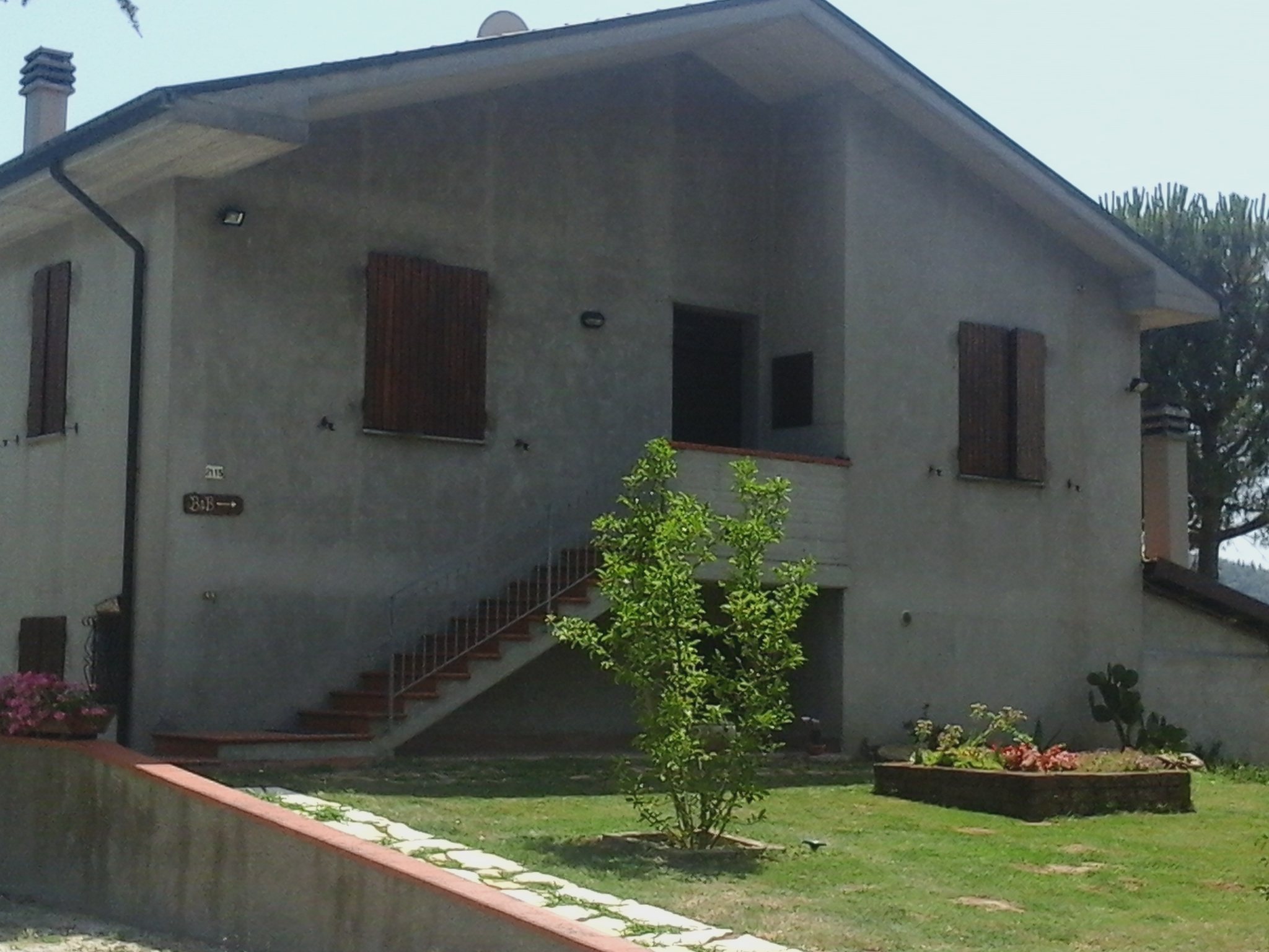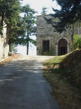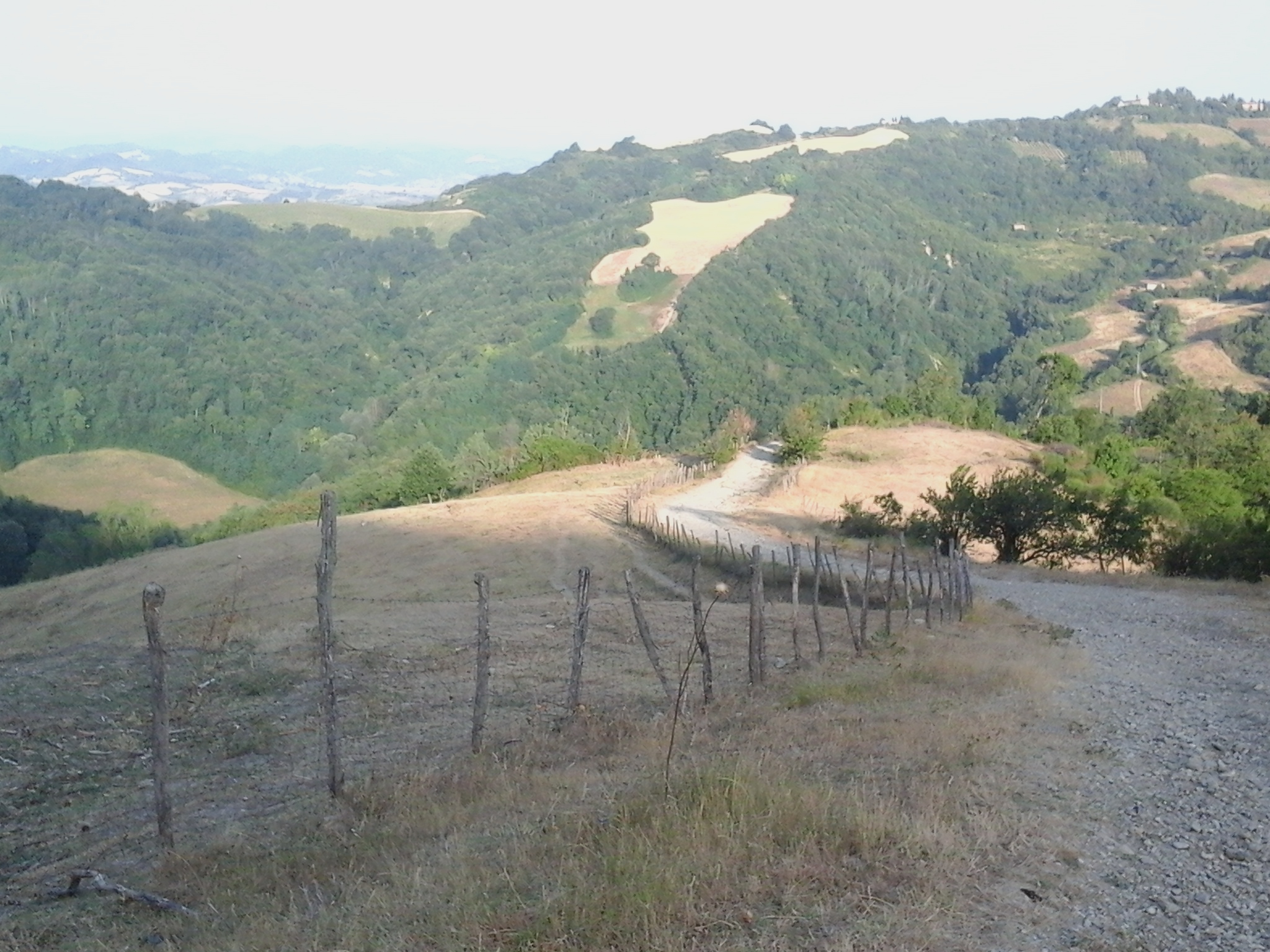 La deviazione corretta era subito prima di entrare in paese. E si tratta di una strada asfaltata, che mi permette una buona andatura e che proseguirà lungamente in discesa fino al fondovalle, dove corre la E45 Cesena-Roma.
