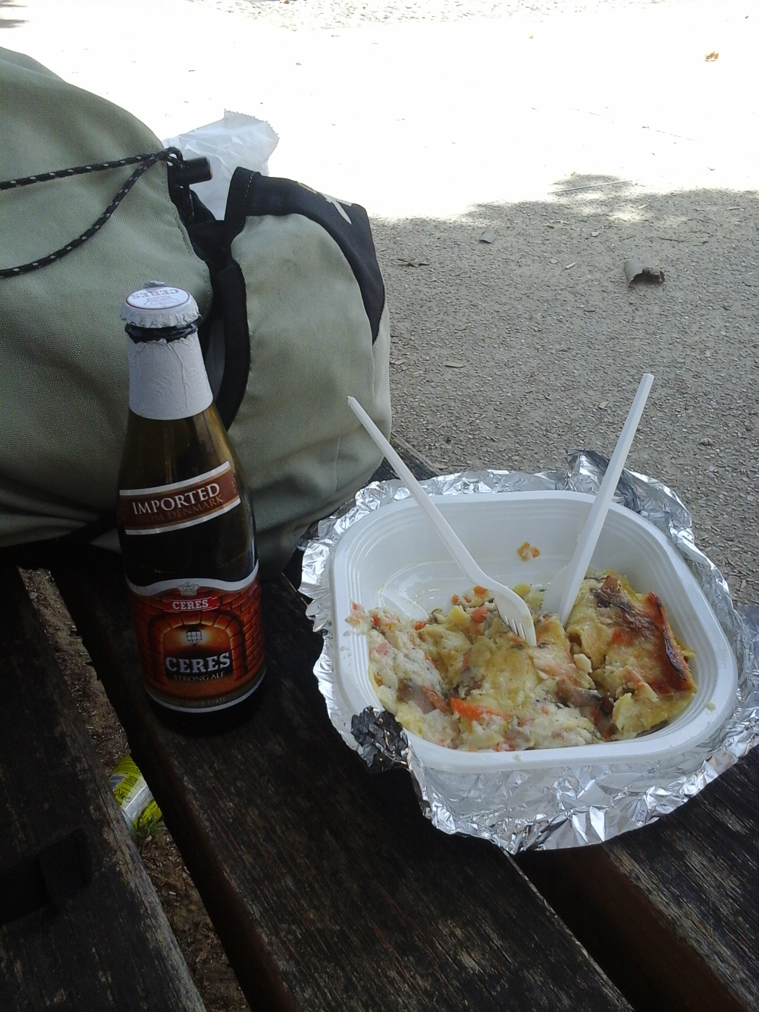 Prendo una porzione abbondante di sformato di verdure, poi completo l’opera entrando in un bar (aria gelida sulla mia maglietta un po’ sudata…) e chiedo una birra da portare via.