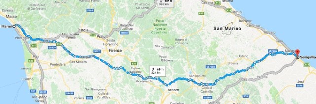 Se tutto andrà bene, potrò così chiudere un triangolo geografico iniziato due anni fa da casa a Forte dei Marmi lungo l’antica via Vandelli e proseguito, l’anno scorso, con il ritorno a piedi dal “Caterraduno” di Senigallia.