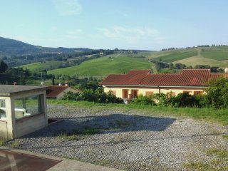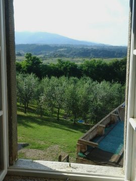 Quest’immagine è stata da me scattata dalla camera del miniappartamento che ho affittato qui nel piccolo paese di Meleto: niente male, come veduta, e gli ambienti sono un po’ spartani ma belli freschi. Per il resto si tratta di un “Bed and bast”, perché la colazione non è prevista e, visto che qui a Meleto non ci sono negozi né bar, anche per la cena ho dovuto arrangiarmi: pane comprato ieri, salsa di olive e melanzane della scorta iniziale e, come dessert, diversi cucchiaini di ottimo polline regalatomi da Massimo.