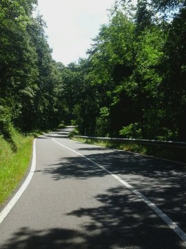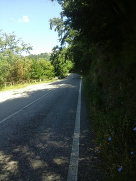 Dopo il minuscolo centro abitato, infatti, comincia la lunga salita fino al valico della Scheggia e la strada cambia aspetto, immergendosi in una vegetazione boschiva, presentando diverse curve e, ciò che più conta per me, calando vistosamente l’intensità del traffico: per lunghi tratti non passa più nessun veicolo e si tornano a sentire gli uccellini e le rare ma benvenute folate di vento.