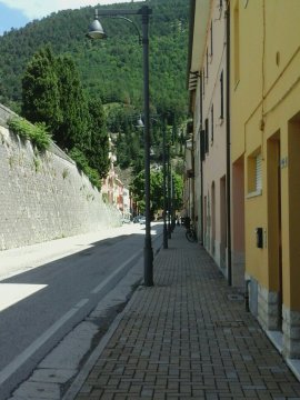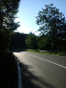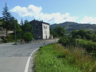 Una tappa facile, oggi: venti chilometri di discesa, tutti su questa strada, curiosamente statale fino al confine regionale fra Umbria e Marche (che raggiungo presto) e provinciale di lì in poi.