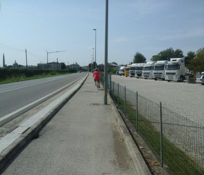 La strada è così larga, ma molto più trafficata, un via vai sfrecciante e ossessivo, mentre la pista ciclo-pedonale lascia il posto a una semplice corsia dedicata.