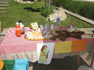 Qui, davanti a un cortile, qualcuno ha attrezzato un tavolino con generi di conforto e ristoro a uso dei pellegrini.
