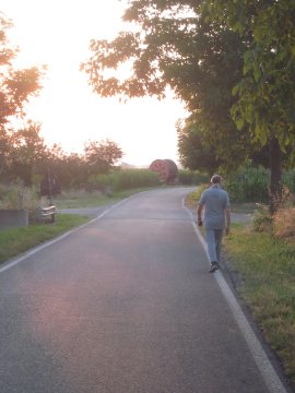 La luce del primo mattino, poco più tardi nell’uscire dalla cittadina, illumina un solitario mattiniero passeggiatore di questa domenica.