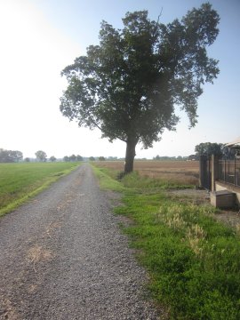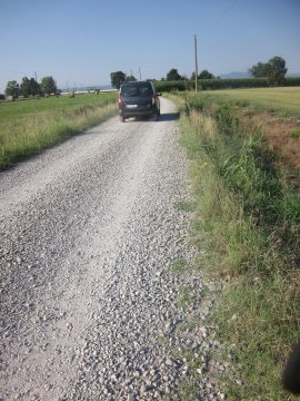 A differenza di ieri, quando il percorso si è inoltrato suggestivamente in mezzo a campi vasti a perdita d’occhio, finora oggi le vestigia umane hanno sempre spezzato il paesaggio agreste. Ora però, che sto entrando nella parte centrale, la comparsa improvvisa di una stradina ghiaiosa mi fa presagire un nuovo tuffo nella campagna imperante.