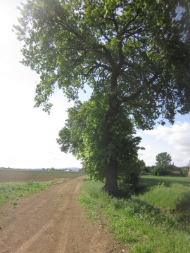 Dovendo rinunciare alla sosta in un bar, mi lascio attrarre da un grande albero, adocchiato da lontano, che domina una stradetta laterale in terra battuta.
