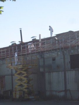 Un gruppo di operai stanno lavorando sul tetto di un grande edificio industriale: le loro tute bianche integrali fanno pensare a una bonifica dall’amianto.