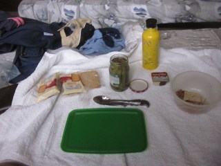 Dopo aver aperto il vasetto, che in realtà contiene dei grossi peperoncini verdi piccanti e sott’aceto, allestisco il mio lauto pranzo dando fondo alle mie riserve: sei fette biscottate, quattro crackers semintegrali, tre gherigli di noce spezzati in due parti…