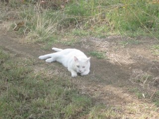 Inginocchiandomi alla sua altezza, vinco le ritrosie di questo bel micione bianco, che alla fine mi concede (o si concede?) una strusciata sul mio fondoschiena; ma quando cerco di fotografarlo da vicino, il ronzio dello zoom lo innervosisce.