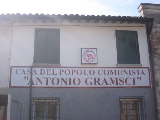 Un’insegna, dall’aspetto assolutamente moderno, si ammanta inevitabilmente dell’atmosfera di lontane guerre fredde, e proverbiali dispute strapaesane fra sindaci e parroci…